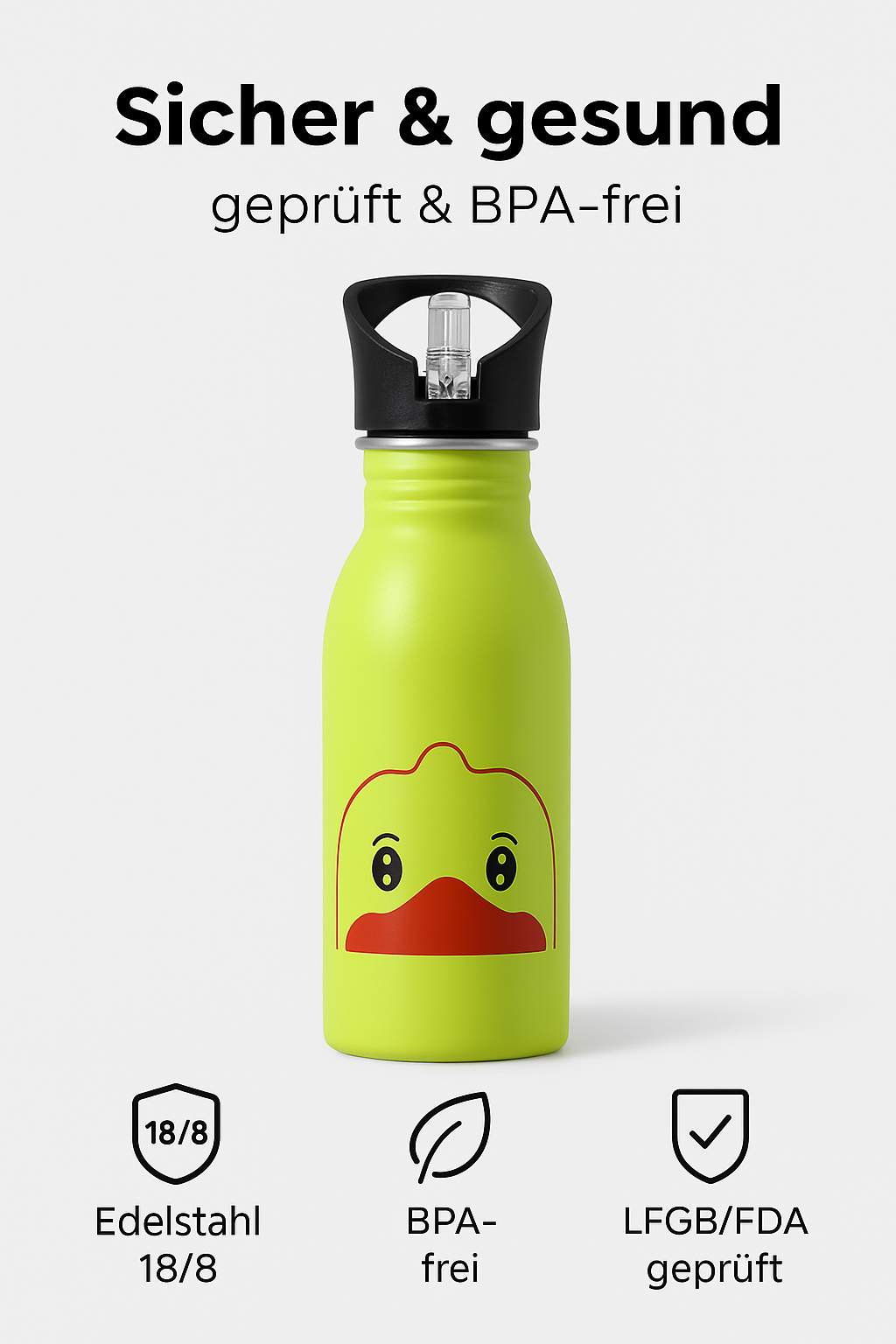 Gefertigt aus hochwertigem 18/8-Edelstahl, garantiert die Flasche absolute Sicherheit. Sie ist BPA-frei, phthalatfrei, LFGB- und FDA-zertifiziert – damit Kinder jederzeit bedenkenlos trinken können.