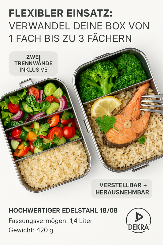 Premium Edelstahl Brotdose 1400 ml mit 3 Fächern Auslaufsicher. Nachhaltig. Alltagstauglich.