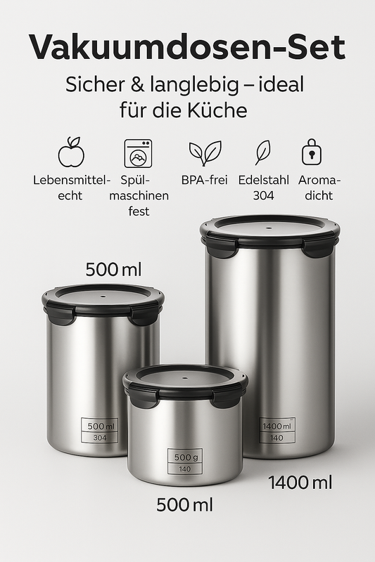 Edelstahl Vorratsdosen Set mit Deckel – 500ml, 900ml & 1400ml luftdicht, stapelbar & langlebig